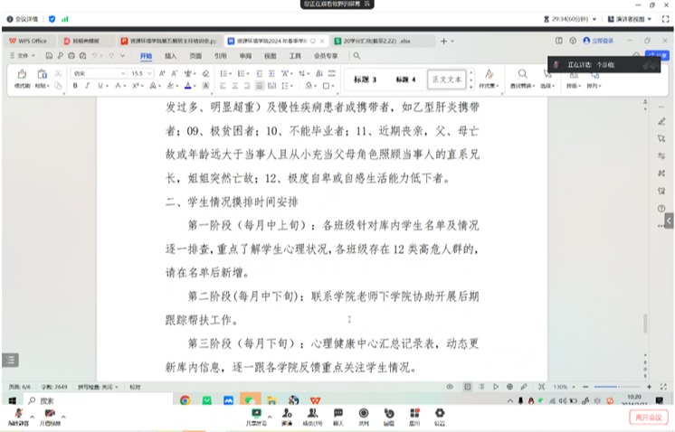 李彦伯老师介绍了心理健康教育相关工作,提醒各班主任在开学心理危机高发期,摸排重点关注学生近况,对重点关注学生开展访谈,时刻关心学生心理健康,体现细心、耐心、关心。李彦伯老师表示学院将力所能及地为学生们提供帮助。