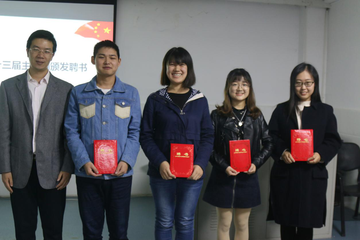 院团委书记王文锋老师宣读第十四届学生主席团任命书,之后,四位第十四届学生主席团代表青传副主编李清韵院学生会副主席杨一伦院社联主席聂梓源、院志协主席李红润先后发言