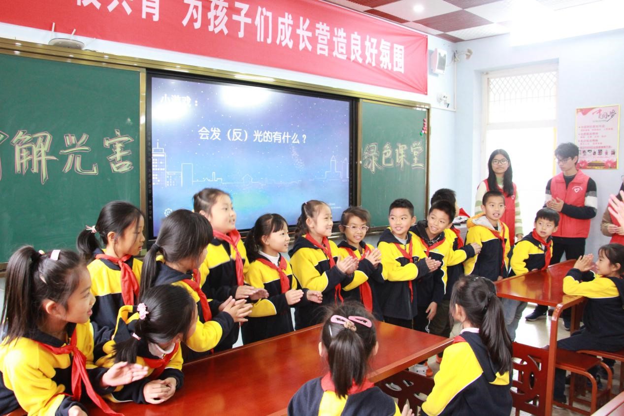 首先,沙湖环保志愿队的吴艳林同学从光污染的定义、分类、危害以及光污染的防治四个方面为小朋友们生动、详细地阐释了光害的相关知识,并播放了光污染科普动画小视频。在互动小游戏环节,小朋友们围绕“发光的物体有哪些?”“光的危害有哪些?”两个问题,踊跃参与,争相回答,并靠自己的聪明智慧赢得了环保小奖品。环保课堂在轻松、活泼的氛围中展开,引来小朋友们极大的兴趣。