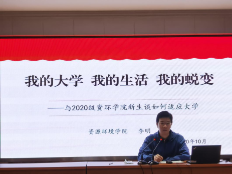 10月13日上午,学院党委副书记李明老师为新生做题为《我的大学,我的生活,我的蜕变——与2020级资环学院新生谈如何适应大学》的专题讲座。会上,李明老师从“为什么要上大学?”“上大学要做什么?”“如何正视自己的大学?”等问题引入,启发同学们思考从高中过渡到大学阶段应该怎样调整学习心态;怎样正确看待自己考取的学校及所学专业;怎样处理好学习与课外活动之间的关系。通过案例分析,李明老师为新生讲解了防诈骗相关知识;并引导同学们规划个人就业目标,思考在大学期间培养自己的核心竞争力。“大一新生要处理好四种关系,即过去与将来;课堂与课外;自由与自律;思想与行动。”讲座最后,李明老师勉励同学们要在“学、思、践、悟”中学习经验,收获成长,历练品性,成为更优秀的自己。