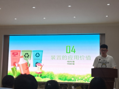 材料科学与工程学院胡成同学从项目背景、装置组成、视频展示、智能未来等四个维度介绍了智能瓶罐垃圾回收装置。他从政治环境、社会环境、经济环境和技术环境等四个方面分析了该项目的前景,认为智能瓶罐垃圾回收具有减少环境污染、创造更大价值、提高效率与节约成本方面的意义,结合视频展示讲解了装置的组成部分,包括供电装置、分类装置、压缩装置、存储装置和其他部分(LED屏幕、微信小程序返现、指示灯、语言对话功能等),另外该装置在公交车站、公园座椅和购物广场等不同场景可以有不同功能,这也是该装置的特殊之处。