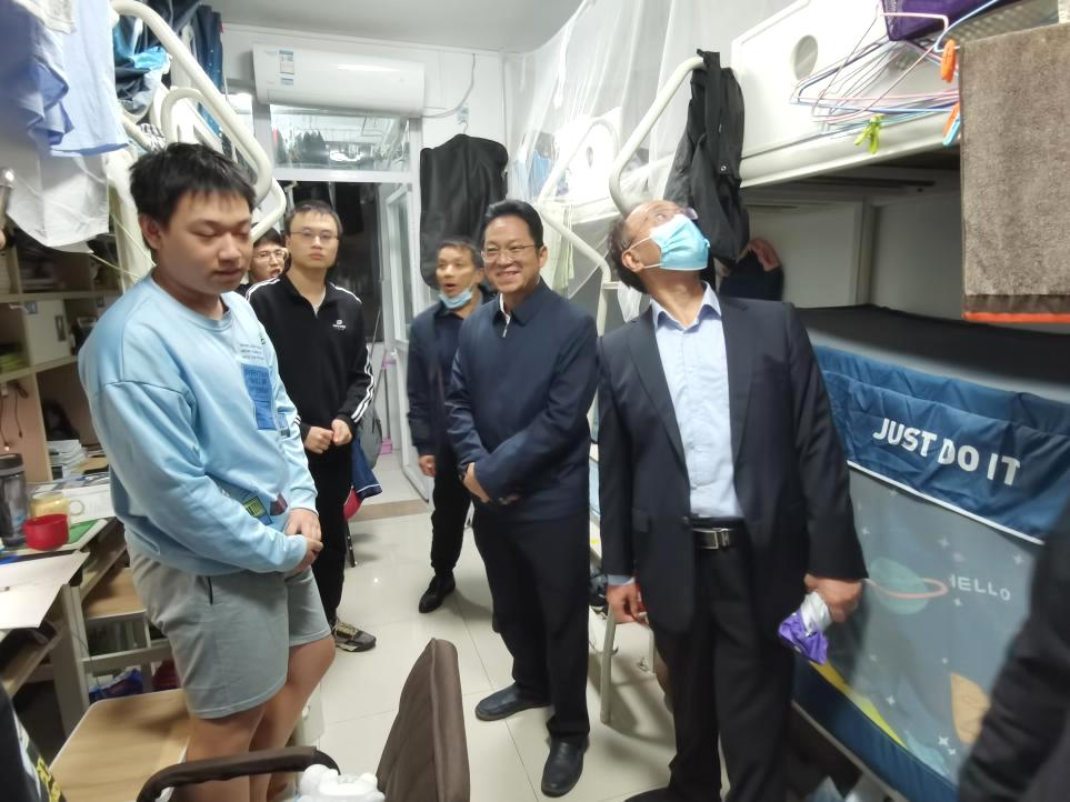 在二期A栋学生宿舍,肖德副校长相继走访了我院2020级、2019级部分本科生宿舍。肖校长向同学们介绍了当前学校和全国疫情防控的新形势、新要求,传达了学校领导和老师对同学们的关心和关爱。他细心叮嘱同学们加强时间管理、养成良好的学习和生活习惯,注意个人身心健康,加强体育锻炼,并鼓励毕业年级同学做好未来规划,提高抗压能力,积极主动就业。