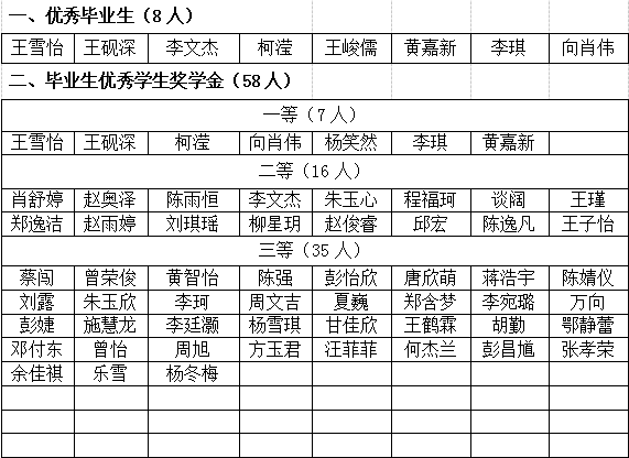 资环学院2023届优秀毕业生和毕业生奖学金评审结果公示 作者:发布时间:2023-03-28点击率: 资环学院2023届优秀毕业生和毕业生奖学金评审结果公示 根据《关于组织开展2023届毕业生优秀学生奖学金、先进荣誉称号评定工作的通知》,经个人申报、学院评审,现将资环学院2023届优秀毕业生和毕业生奖学金评审结果公示如下: 公示时间:2023年3月27日——3月29日,公示期间如有异议,请至学院201办公室反映。 英国上市公司365学生工作办公室 2023年3月27日