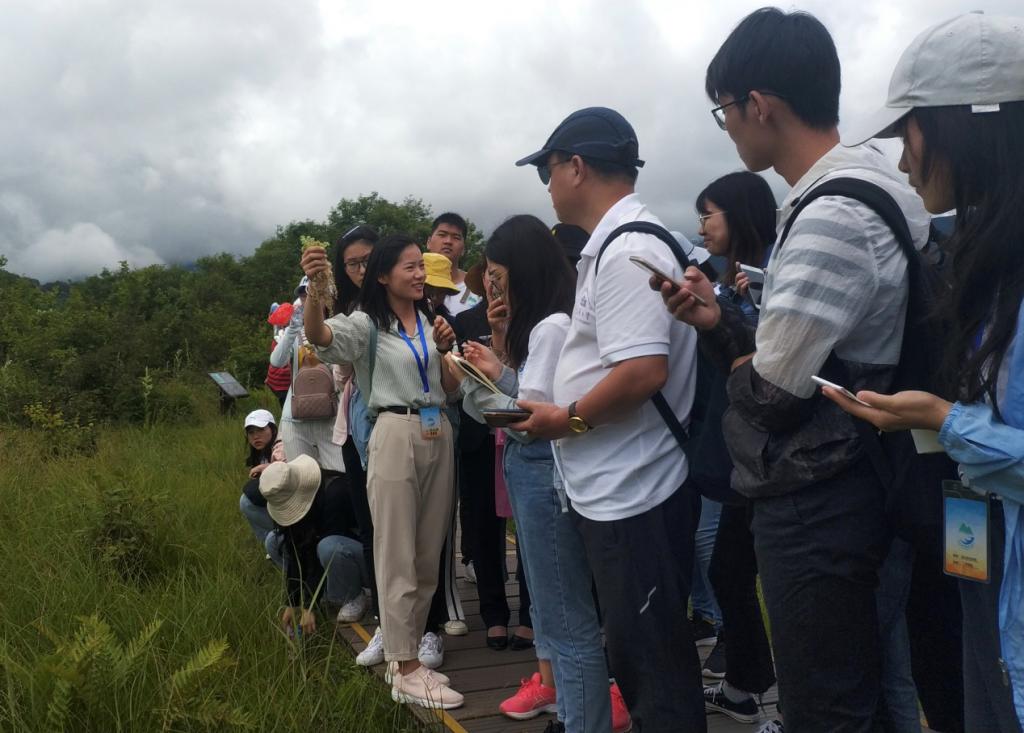7月19日,实习队伍从兴山抵达神农架大九湖。在坪阡镇,河南大学乔家君教授讲解了当地生态移民村的结构布局、地广人稀的城镇特点以及自身独特的自然景观。随后,在大九湖湿地博物馆内,中国地质大学(武汉)黄咸雨教授为大家介绍了泥炭沼泽的定义、生态功能以及底部沉积泥炭的作用。黄教授指出,泥炭的累积是一个极为缓慢的过程,通过对泥炭柱中多种指标(如同位素、有壳变形虫等)的分析,能够反推出古气候古环境变化,同时为预测未来环境变化提供依据。在大家对泥炭沼泽有了基本的认识后,便前往大九湖湿地实地考察。在3号湖泥炭藓湿地分布区域,我院李亭亭老师现场向同学们讲述了泥炭藓湿地在全球以及在我国的分布情况、大九湖泥炭藓湿地的发育过程、泥炭藓的生长和生理结构特性以及泥炭藓湿地的主要生态价值。李老师讲到,尽管泥炭藓湿地在全球分布较为广泛,但主要集中在北半球的45°N~60°N,而亚热带区域分布稀少。泥炭藓湿地具有固碳、维持并保护生物多样性、调节水文、净化水体等重要功能。通过李老师的介绍,大家意识到亚热带亚高山泥炭藓湿地的珍贵性及其巨大的保护价值。19日下午,在九号湖附近,黄咸雨老师为大家介绍了大九湖独特的地质条件,以及人工干扰对大九湖湿地的影响。
