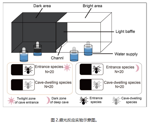 近年来,越来越多的研究发现,一些生活在无光环境中的无眼地下动物依然保留了感光能力,其背后的驱动力及演化过程有待探索。一部分研究者提出无眼地下动物不再需要感光能力,是由于中性进化时间不够长,处于正在丢失的过程中,即中性选择假说;也有研究者提出感光功能对于无眼地下动物仍然重要,有助于它们选择栖息地、逃避洞外天敌和竞争者,因此其保留是自然选择驱动的结果,即自然选择假说。刘杰教授团队利用广泛分布于中国西南地区喀斯特溶洞中的小弱蛛洞内种及洞口种来检验上述两种假说(图1)。
