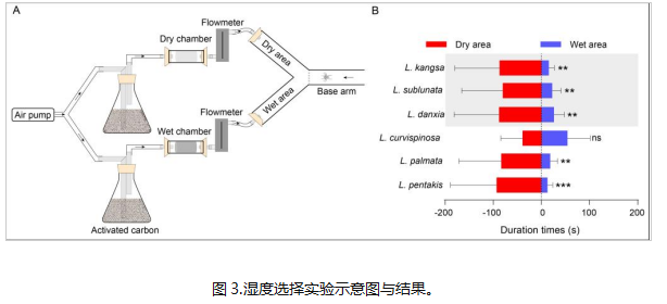 团队通过野外行为学实验发现:小弱蛛洞口种和小弱蛛洞内种都表现出明显的避光反应,说明无眼/退化的洞内小弱蛛依然保留着感光能力(图2);小弱蛛洞内种离开洞内环境则死亡率显著升高,保水抗旱能力的减弱可能是主要因素之一,而避光反应/感光功能的保留有助于躲避不利的洞外环境,这支持自然选择假说。但是否有其它因素促成这样的选择呢?团队做了“湿度选择”实验,发现洞内真洞穴小弱蛛更喜欢干燥的环境,这表明如果依靠湿度感受器,它们反而会往洞口干燥但不适宜生存的环境迁移,这也就更加突出其感光能力的重要性(图3)。团队还通过转录组数据分析等生物信息学手段,再次证实了小弱蛛洞内种依然保留感光能力,是自然选择的结果而非遗传残留(图4)。