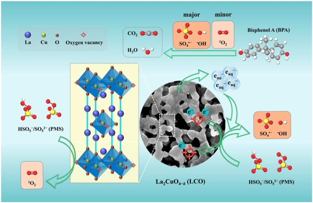当前,为减轻甚至消除日益严重水污染问题,亟需开发高效、低成本和环境友好的新兴水处理技术。近年来,基于硫酸根自由基的非均相高级氧化技术引起了广泛的关注,其技术核心在于高性能异相催化剂的设计以及界面催化机制的揭示。针对上述问题,该论文制备了一种具有良好低温还原性、富表面氧物种及氧空位的钙钛矿氧化物(La2CuO4-δ, LCO),并成功应用于活化过硫酸盐高效降解水中内分泌干扰物双酚A(BPA)。研究发现,与传统的以氧化物表面不同价态过渡金属离子(Mn+)为活性位点的反应机制不同,本论文提出一种界面活化新途径,即钙钛矿氧化物表面富含局域电子的氧空位可以通过单电子转移或者产生水合电子(eaq)等方式,直接活化过硫酸盐产生吸附态硫酸盐自由基(SO4•−)和羟基自由基(OH)等强氧化性物种,降解有机污染物BPA。此外,文章还揭示了BPA的降解历程和转化机理,并证实LCO/PMS体系具有较高的实际应用潜力,能在不同实际水体中有效降解BPA。相关研究为高效非均相催化剂的制备,及其催化氧化去除有机污染物的广泛应用提供技术支撑与理论指导。