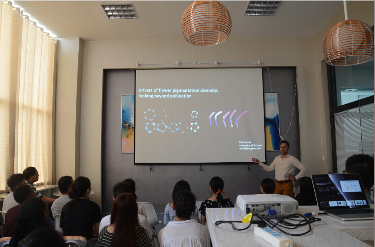 8月5日上午,Laura Galloway教授在我院工会活动室开展了题为“Interactions between Drift and Selection in the Evolution of Plant Reproduction”的学术报告。Galloway教授首先就长时间尺度上植物从最适生态位往周边扩散过程中遇到的生态限制(pollinator),进化限制(bottleneck)和随机因素(drift)进行了详细的阐述,这些因素往往会导致植物的不同居群随着扩散线路产生繁殖方面的响应。后通过调查草本植物美洲风铃草现存分布范围内的20余个居群,发现其确实存在沿扩散线路方向的主动自交水平的提升。Galloway教授团队通过多种野外和控制实验否定了生态因素,肯定了遗传漂变在种群扩散过程中对繁殖的影响。同日,Matthew Koski博士也进行了一场学术报告,题目为“The Ecological Drivers of Floral Pigmentation Diversity: Looking beyond Pollinators”。该报告从画面上就十分吸引人,花朵的各种颜色五彩缤纷,绚丽多姿。Koski博士从图像入手为大家生动的讲解了花朵和花内器官的可见光和UV图案的多样性和各种可能的进化推手;而后用三个独立的实验研究为师生们揭开了美丽多变的花朵背后的真相,即它们更大程度上受物理因素温度和光照影响,人类可见的颜色变化只不过是植物为抵御强光和高温产生化合物的副产品。