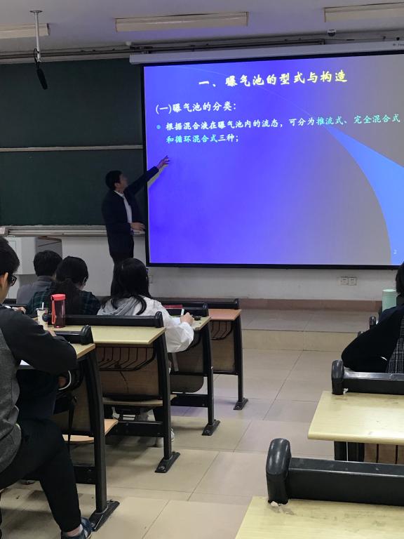 本次课程分为两个部分。首先,卢进登副教授向大家讲解曝气池的型式与构造。通过书面文字的讲述、板书绘图的解析和曝气池图片的介绍,细致形象地让大家了解曝气池的基础知识。接着,卢老师进入到第二个部分——曝气池的原理与计算。在讲述完基本原理后,老师开始讲解本堂课的重点计算内容,将繁杂难懂的计算转化简单易懂的语言,易于同学们理解与应用。期间,卢老师与同学们进行了恰当的互动,活跃了课堂氛围。卢老师以自己丰富的教学经验,教授同学们曝气池的知识。