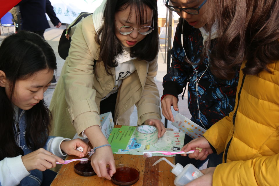上午七点钟,志愿者们早早地来到活动场地着手准备,认真布置。各院均分为服务区、游戏区、项目区三个场地,而资环学院则结合院系专业特长,在服务区设置了制作叶脉书签的活动。参与者只需用牙刷轻轻刷去已用氢氧化钠煮过的叶肉,再吸去表面的水分,就可以获得一枚自己亲手参与制作的叶脉书签了。现场拿着叶脉书签的参与者周伊萌开心地说:“和参与化院叶脉书签制作不同的是,这枚书签我现在可以拿走了,同时带走的还有制作它的方法,‘落叶飞花’,原来每一样东西都可以变废为宝。”