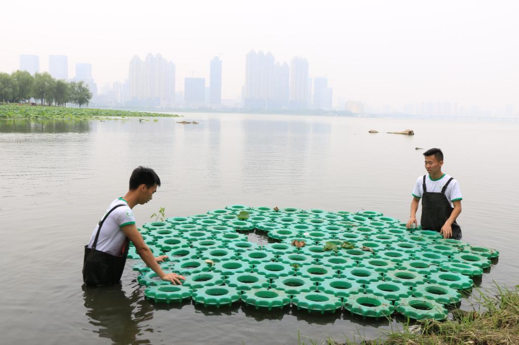 “人工生物浮岛技术是将挺水植物或喜水的陆生植物移植到浮体上栽培,通过植物根系的截留、吸收、吸附等作用削减水中的氮、磷等营养物质,降低水体富营养化程度。”此次活动指导老师、资环学院教授卢进登介绍,“此技术也能为水中微生物提供很好的生长环境,发达的植物根系为微生物的生长提供了很好的环境,通过微生物降解有机物、脱氮等,又可以进一步净化水质,同时也可以营造美丽的景观。”