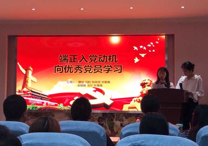 同学们的思想汇报主要围绕着“端正入党动机”和“向优秀共产党员学习”两个方面展开。来自十一个小组的同学依次上台通过演讲的形式汇报了所在小组的学习收获,各小组在汇报过程中都着重谈论了“端正入党动机”的话题。其中,第一组的尹琛同学向大家详细的阐述了“什么是正确的入党动机”,而第四组的甘婉依同学和第七组的田露清同学又从“端正入党动机的重要性”和“产生不正确的入党动机”两个方面说出了自己的理解。