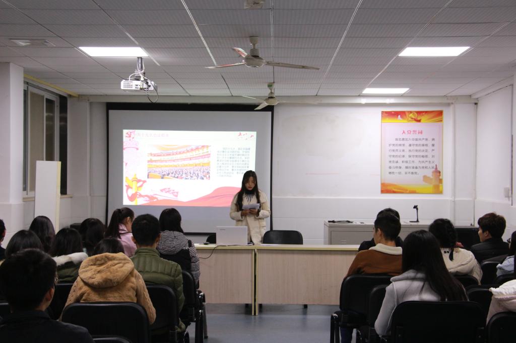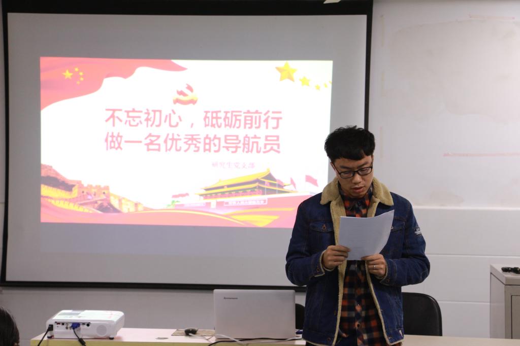 城规党支部发展对象代表舒服第一个发言,他引用习近平总书记在十九大报告中对广大青年的寄语,以新时代中国青年的理想信念为中心,号召全院同志积极学习十九大精神,树立远大志向,锻炼坚韧不拔的意志,做一名合格的共产党员。作为英国上市公司365的一员,地科党支部发展对象代表许丽婷在分享党支部学习十九大精神的收获时,从学科专业出发,强调新时代资环学子的历史使命和责任,号召同学们既要学好专业知识,又要积极参加实践,努力建设美丽中国。伴随着激昂的《红旗颂》,地信党支部发展对象代表高香结合幻灯片,针对新时代合格导航员的标准,强调合格导航员的标准最根本的就是增强政治意识、大局意识、核心意识、看齐意识,其具体的导航员标准是习近平总书记提出的“四讲四有”。在院学生会工作的环工第一党支部发展对象代表文策联系自己学生工作的经历,从学院“特色迎新”这一点发掘导航员的责任和担当。同样来自环工第一党支部的梁明奇补充道:“作为一名合格导航员要时刻仰望星空,树立坚定的理想信念,更应该弘扬青春正能量,争做积极向上领头羊。”研究生党支部代表杨启池站在研究生的视角,也谈到了对导航员工作的独到见解。“不忘初心,牢记使命”是党的十九大的主题,环工第二党支部发展对象代表王创紧扣导航员的“初心”和“使命”,从导航员的定义和工作目标讲起,号召同志们共同努力,把学院导航工作做得更好。