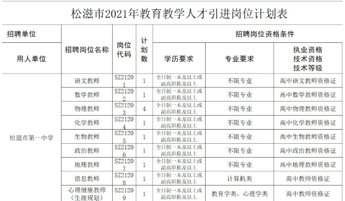 在松滋市2021年人才强市战略——“我选湖北·智汇松滋”计划中,我校计划引进:语文、数学、物理、化学、生物、政治、地理、信息、心理健康学科教师共12名。《松滋一中2021年教育教学人才引进岗位计划表》如下: